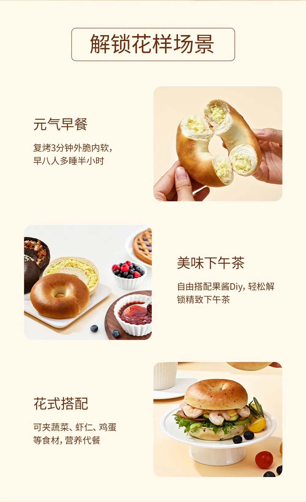 不管是作为元气早餐,复烤3分钟就能拥有外脆内软的口感,让早八人能多睡半小时;还是作为美味下午茶,自由搭配果酱DIY;亦或是夹上蔬菜、虾仁、鸡蛋等食材,当作营养代餐,它都能轻松胜任!