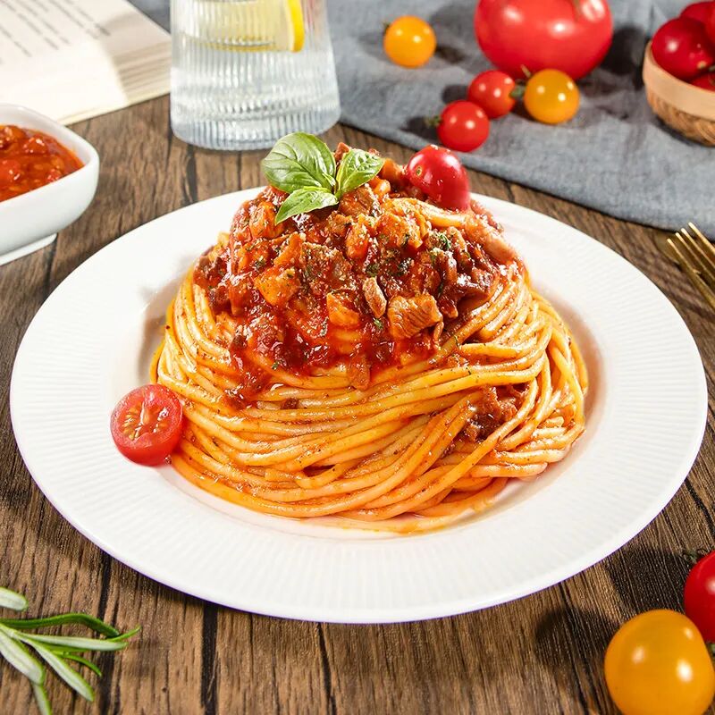 原料都是精挑细选的:意面用的是加拿大硬质小麦,煮出来筋道爽滑,嚼着有扎实的麦香;肉酱里的番茄来自新疆,每天晒够 12 小时太阳,酸甜味特别足,还采用冷破工艺保留新鲜口感;猪肉选的是猪前腿肉,瘦肉多带点肥肉,香而不腻,肉粒分明。