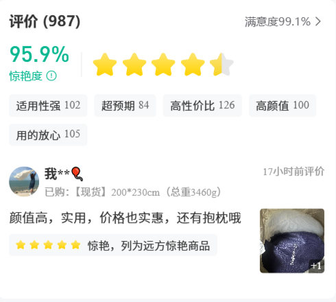 在产品评价体系中,远方是采用"惊艳度"作为核心指标(95%以上为优秀标准),例如"远方日记被子"的惊艳度 95.9%,远超家纺类93%的行业优秀线。