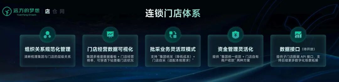 连锁体系的经营模式跟单一店铺安全非常不一样,比如连锁医药企业、水果连锁店,针对这块,单独的开发非常大的IT赋能,通过这套系统构建集团总部与门店的组织关系。