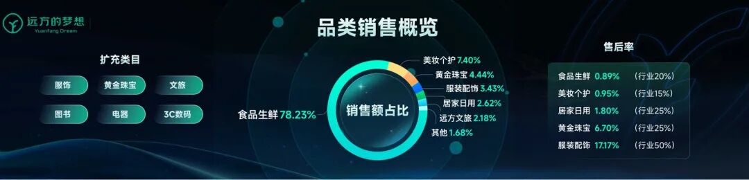 • 食品类占比78.23%,但美妆、服饰、黄金等品类增速显著。