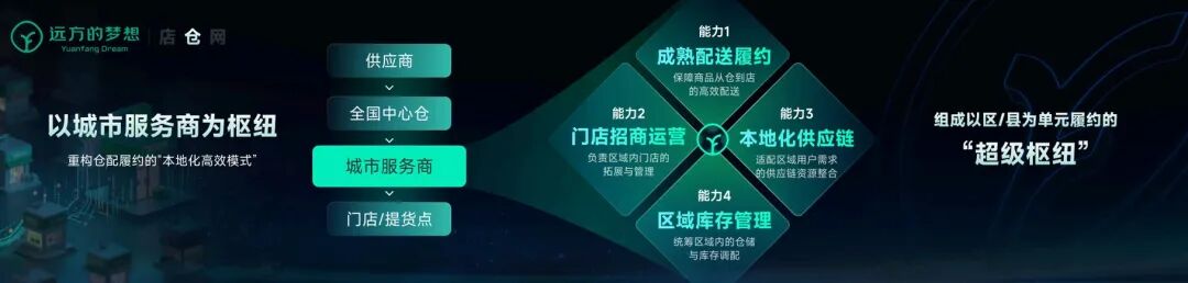 以城市服务商为枢纽:供应商-全国中心仓-城市服务商-门店/提货点