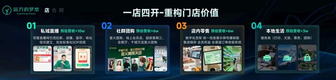 一店四开-重构门店价值,包括社区店播、社群团购、线下零售,还有本地生活。