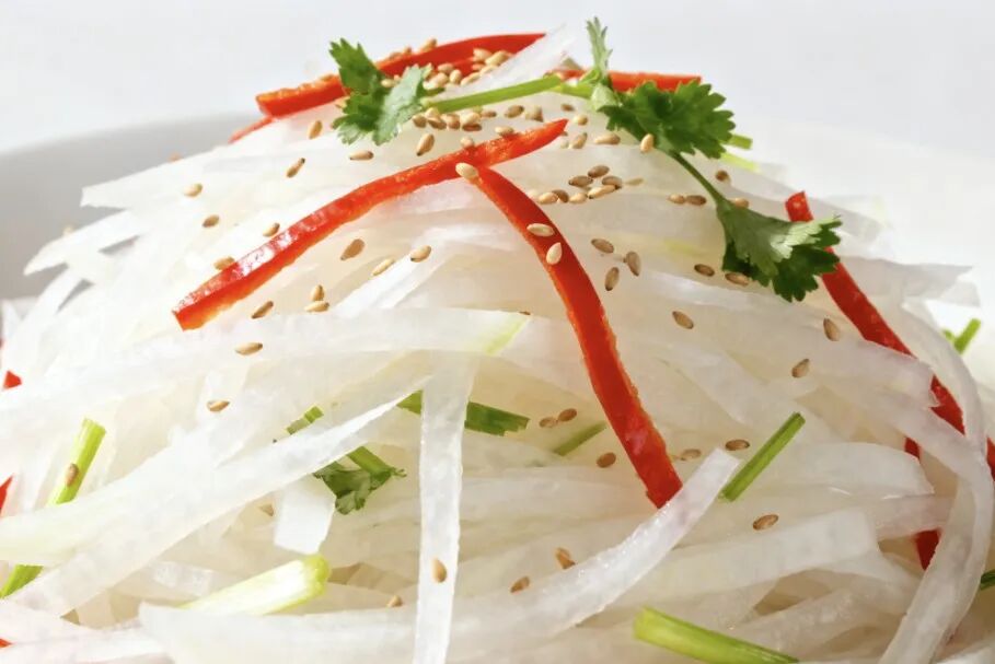 凉拌萝卜丝:白萝卜切丝,加盐腌制10分钟后挤干水分,加入醋、香油、蒜末等调料拌匀。可解油腻,促进消化。