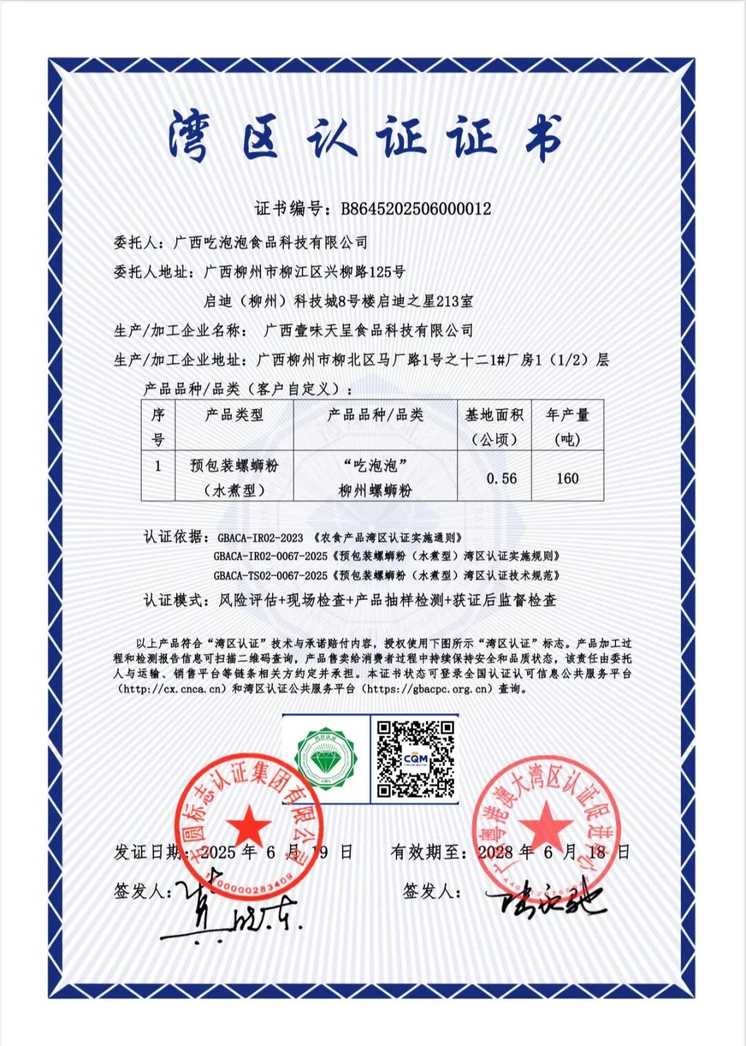 吃得香更要吃得安心,螺蛳粉的豆角、萝卜,甚至酸笋的原料竹笋都是经相关检测证实安全的,目前获得了湾区认证证书。