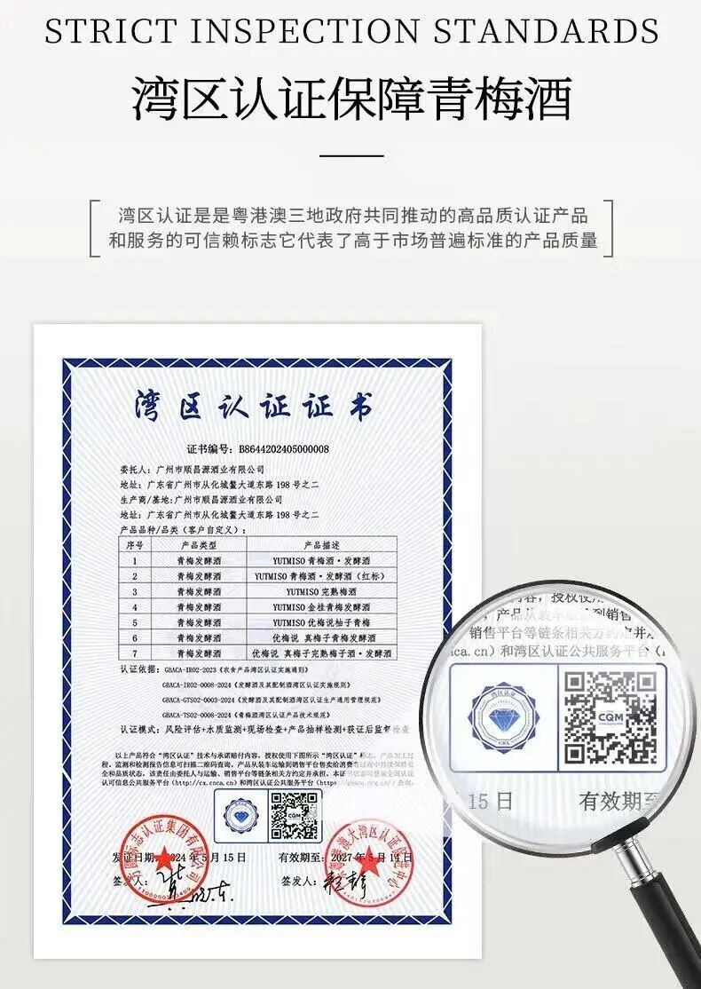 每瓶酒至少采用30颗新鲜青梅酿造,原果汁含量不低于55%,还通过了粤港澳三地政府共同推动的“湾区认证”,这个标志代表着高于市场普遍标准的产品质量,是品质的有力保障!