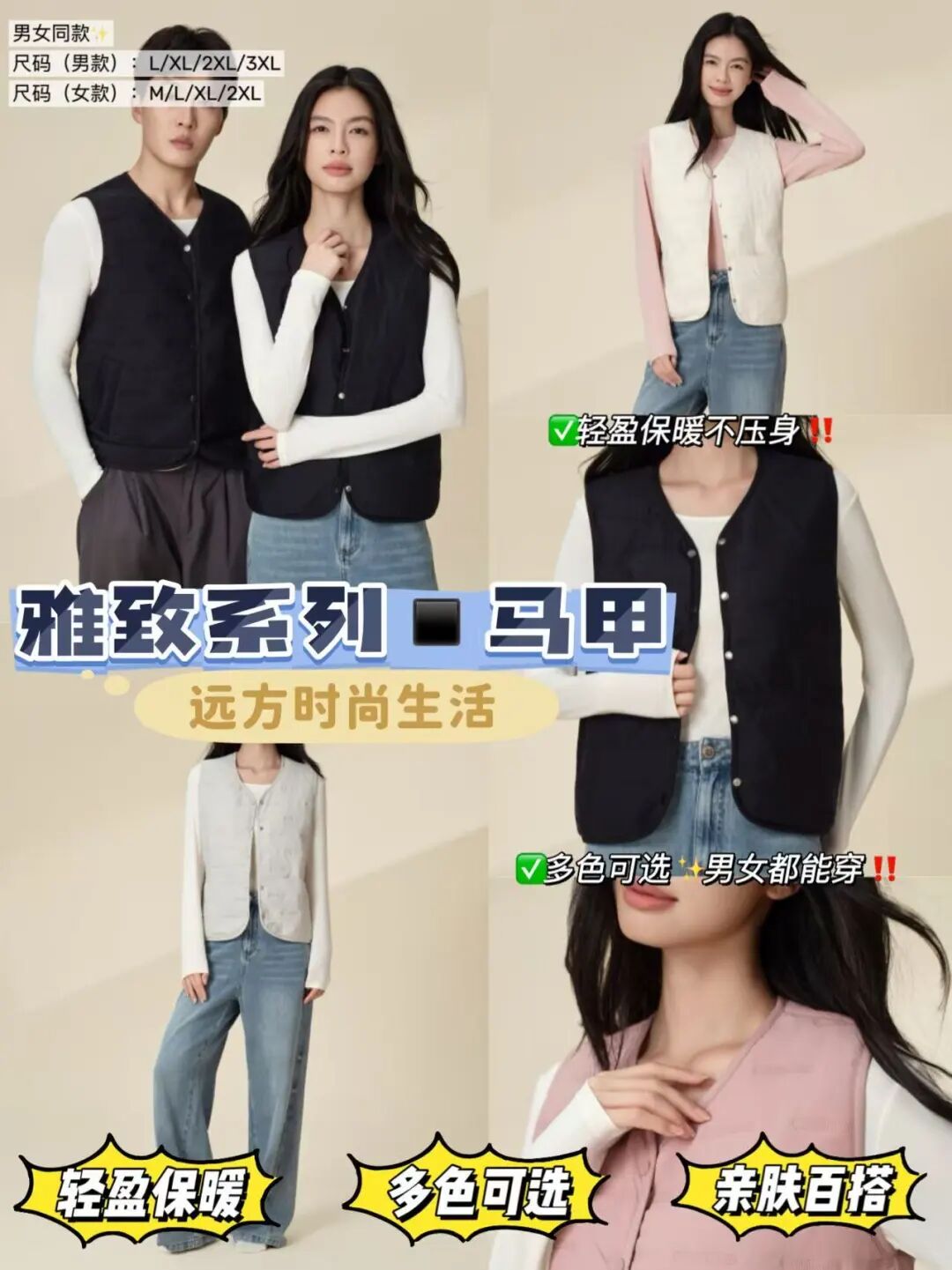 秋冬衣橱里,总需要一件能扛住温差又不失格调的单品。雅致系列马甲便是这个季节的温柔铠甲~轻盈不压身的"行走暖炉" ,降温就可以穿起来啦~