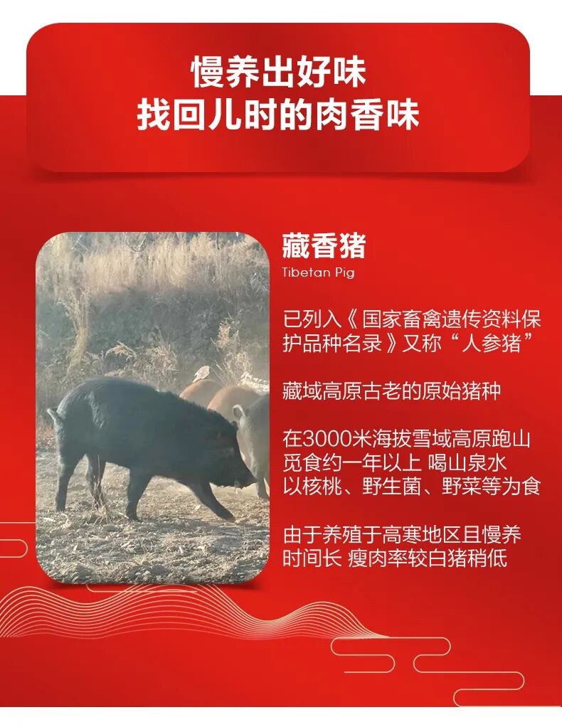相较于圈养4-5个月的速生瘦肉型猪,藏香猪生长周期更长,营养沉淀更充分,肉质弹嫩紧实,肥膘纯白、瘦肉暗红,风味十足。