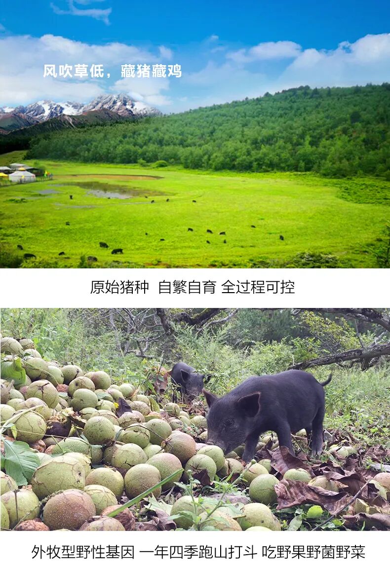 迪庆藏猪是高原原始地方品种,生长在3000米海拔的雪域高原,全程放养为主、早晚适当补饲。