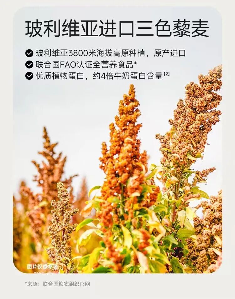 特别添加来自3800米海拔高原的玻利维亚进口三色藜麦——这可是被联合国FAO认证的全营养食品,优质植物蛋白含量约是牛奶的4倍,营养好吸收。