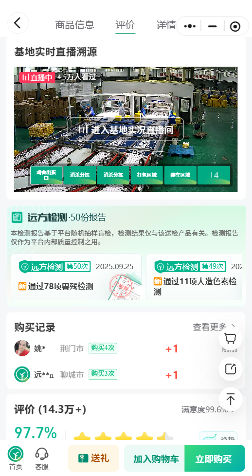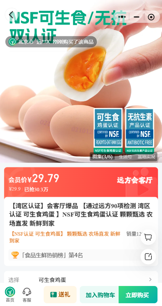 同品质最低价:远方人的口号是“同品质,全网最低价格”。同样的产品,放到任何渠道,远方的价格都是最低的。比如可生食鸡蛋,某天鹅30枚卖75-81元,远方30枚仅29.9元,品质还更高;私域直播引流时,新用户1元就能买到40枚,这样的诚意,让用户闭眼买、反复买。