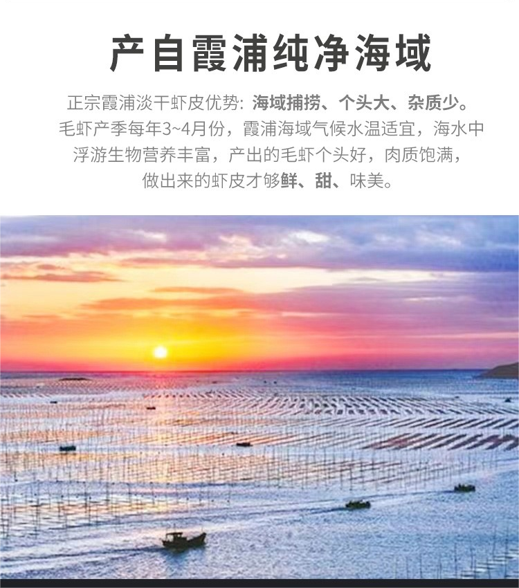 在众多虾皮产地中,福建霞浦的虾皮尤为值得推荐。霞浦海岸线绵长,岛屿港湾众多,水产资源丰富,素有“鱼米之乡”的美誉,得天独厚的地理环境孕育了品质上乘的虾皮。