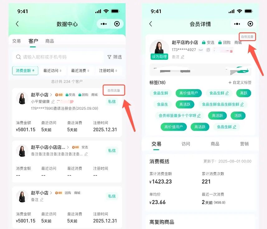 ③奖励完成后,会员数据中心将为该用户标注“自然流量”标签,方便各位伙伴查看区分。