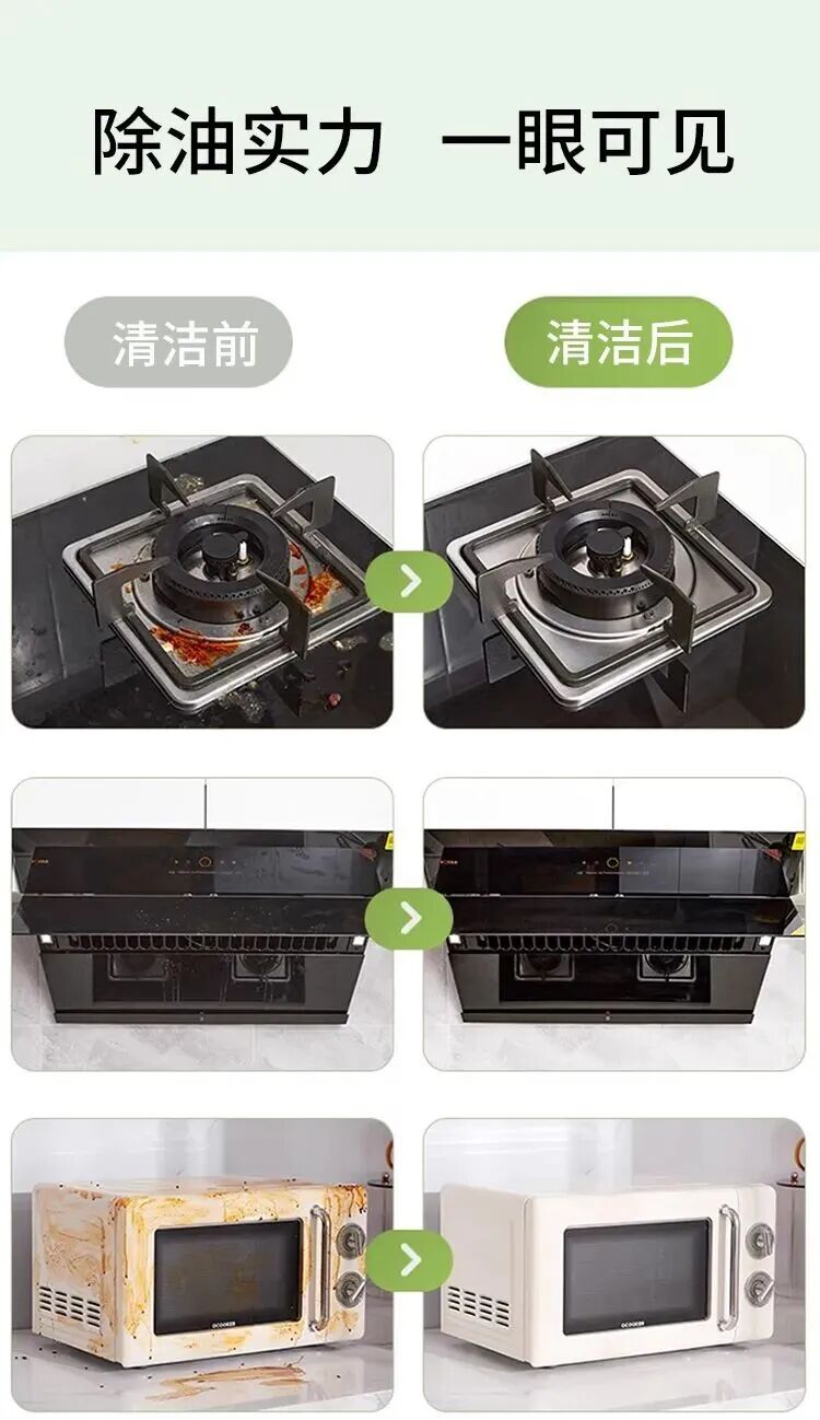 它的核心优势,正是源于高品质的生物酵素配方——专研酵素生态去油污技术,添加高含量生物活性酶,搭配专业去污技术,能快速渗透油污底层,轻松瓦解黏稠油膏、厚硬固态油垢,不管是灶台的飞溅油污、抽油烟机的滤网油垢,还是锅身的烧痕焦渍、锅底的陈年油垢,甚至是洗手台、烤箱、排气扇、瓷砖墙体的油污,都能轻松搞定,喷上后静置几分钟,就能亲眼见证油污慢慢融化,用抹布轻轻一擦,立马恢复洁净透亮,从根源上解决油污难题,不用反复擦拭,大大节省清洁时间。