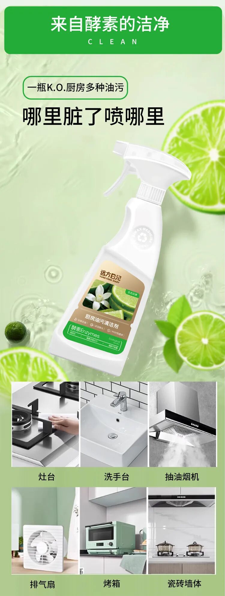 作为专研酵素生物去油污的专业产品,远方好物厨房油污清洁剂,精准戳中所有厨房清洁痛点,一瓶就能K.O.厨房多种油污,哪里脏了喷哪里,无需拆洗,省时又省力,彻底告别“大力擦油污”的狼狈。