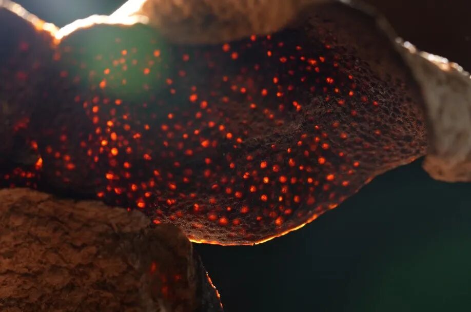 陈皮背面的油室是“品质密码”,优质陈皮的油室呈清晰点状,饱满凸起,摸起来有明显颗粒感;劣皮或新皮的油室则浅平模糊,无质感。油室越饱满,说明挥发油和营养成分越充足,品质越好。
