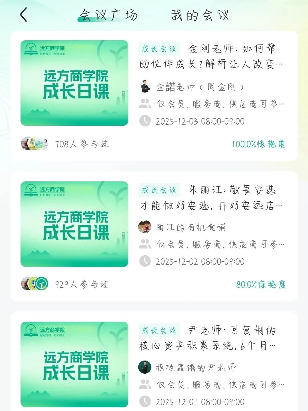 线上陪跑:通过远方好物APP会议中心观看。各服务商、招商总监、供应商根据实体店门店运营、引流、复购、会员管理、产品讲解进行培训。(免费)