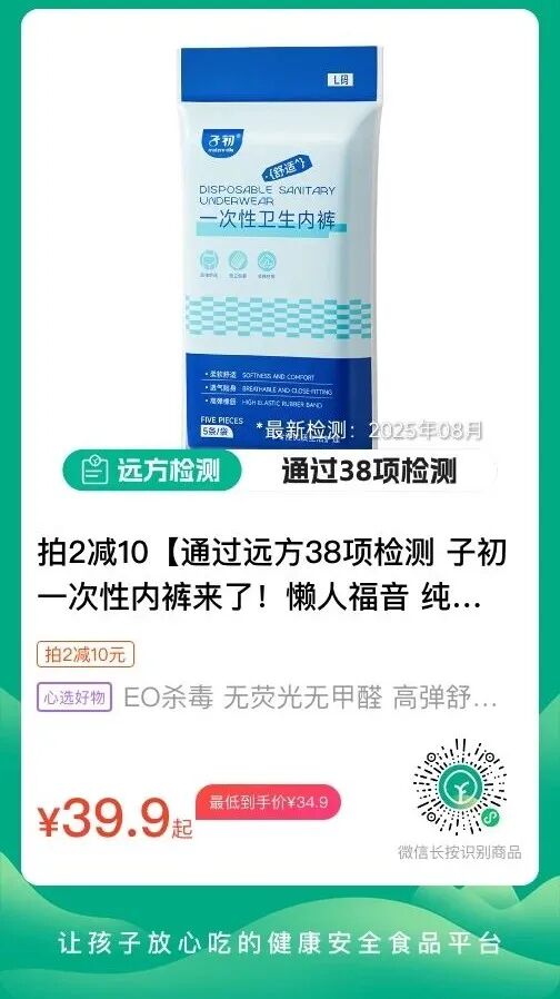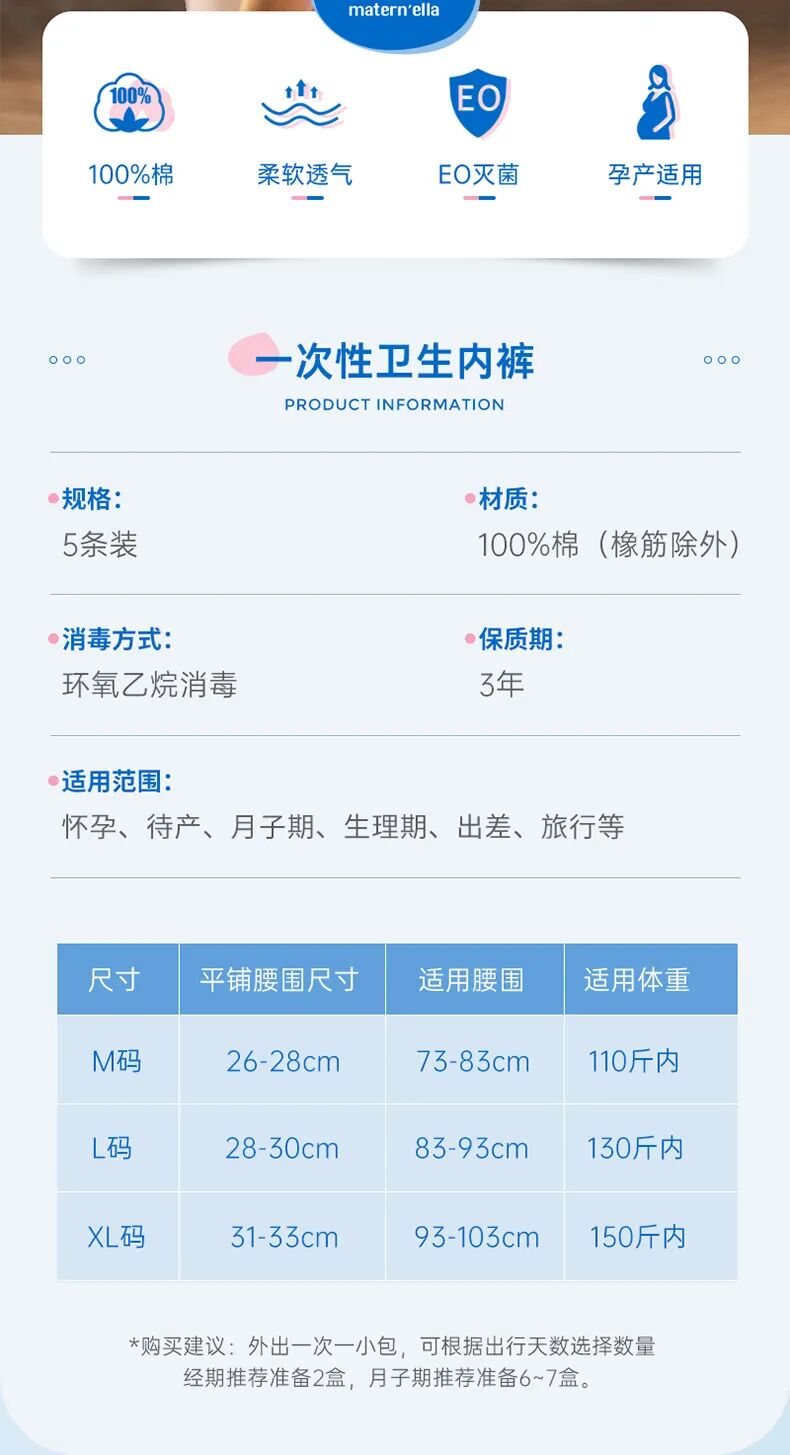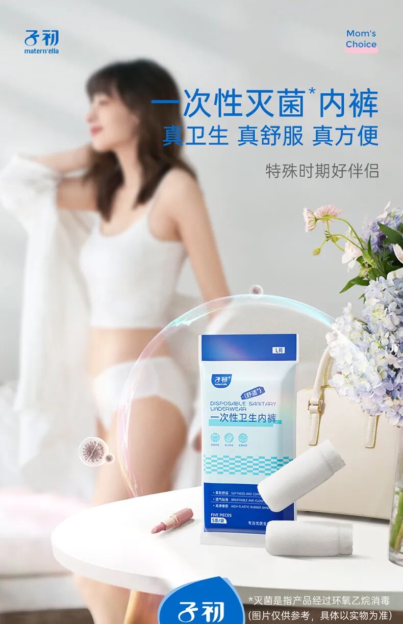一次性内裤绝对是外出“救星”!子初云柔一次性内裤采用天然纯棉面料柔软透气,腰部采用宽边蕾丝皮筋(内含7条橡皮筋),侧边采用窄边皮筋,穿起来弹性十足,不会产生束缚感和勒痕。每条内裤都经过环氧乙烷灭菌消毒,无荧光剂,无印染,不用清洗,即拆即用。采用单独密封包装,干净卫生还便携。