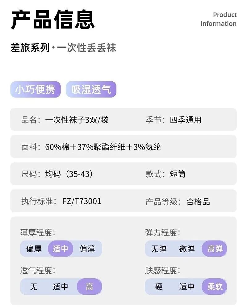 外出逛景区、赶路程,袜子很容易被汗浸湿,要是在酒店洗了,不仅难晾干,还可能有异味;带回家洗,又觉得麻烦。苏软软丢丢袜就能解决这个问题!它是独立包装,材质柔软吸汗,穿起来不闷脚,贴合度也很好。不管是走路太多袜子湿了,还是住酒店不想洗袜子,它都很合适,用完直接扔,不用带脏袜子回家。