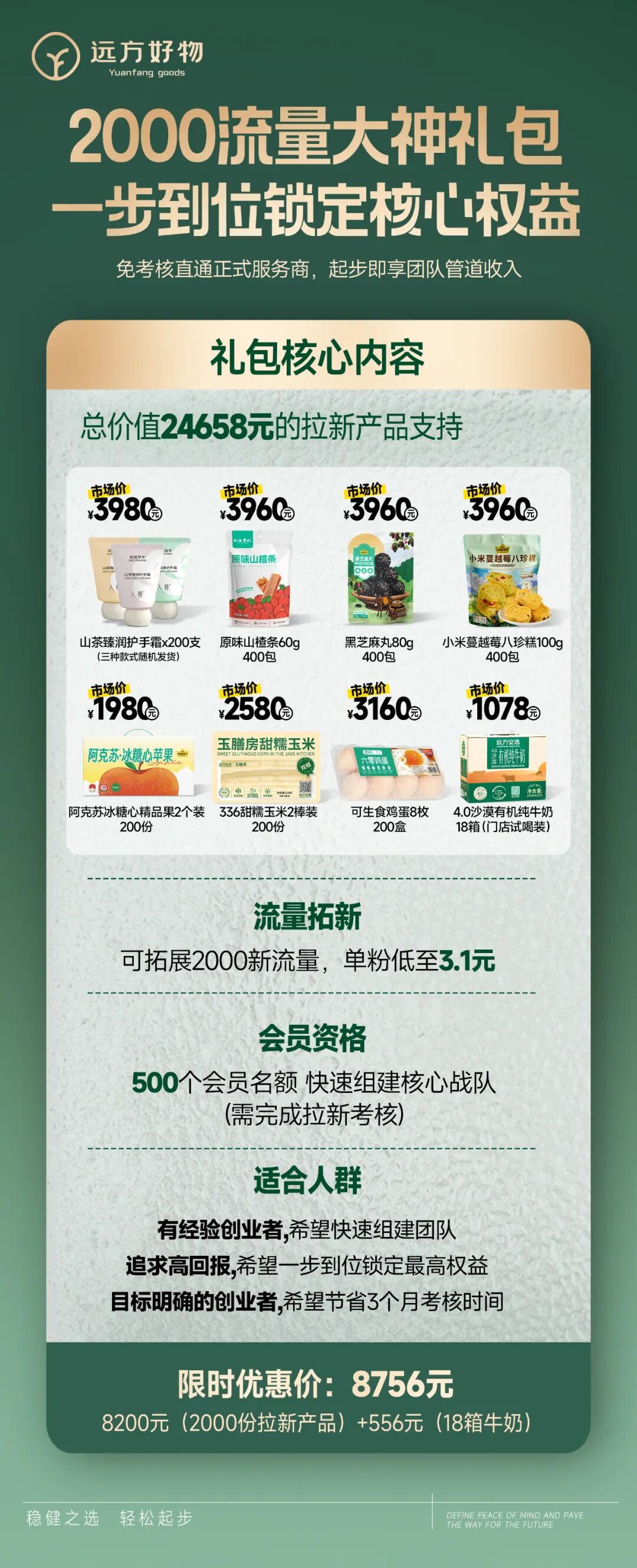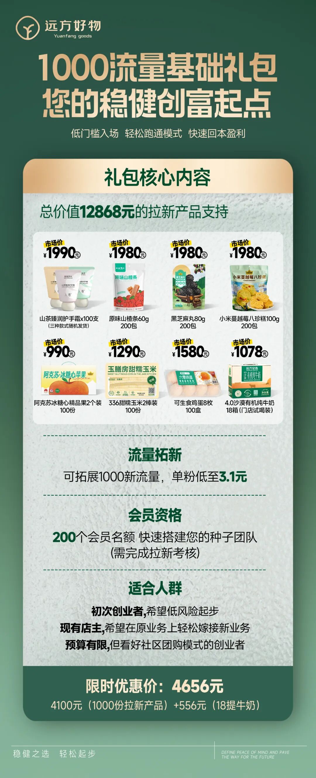 公司会给你提供“拉新大礼包”(方案一4100元准服务商,方案二8200元正式服务商)。客户来店里提货时,你引导他们加微信、进群。这样一来,你就有了第一批种子用户。