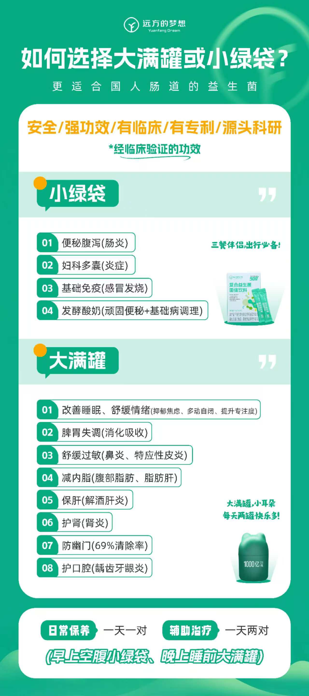 远方好物的小绿袋益生菌和大满罐产品都是基于上述科学选择和健康效应精心研发的。