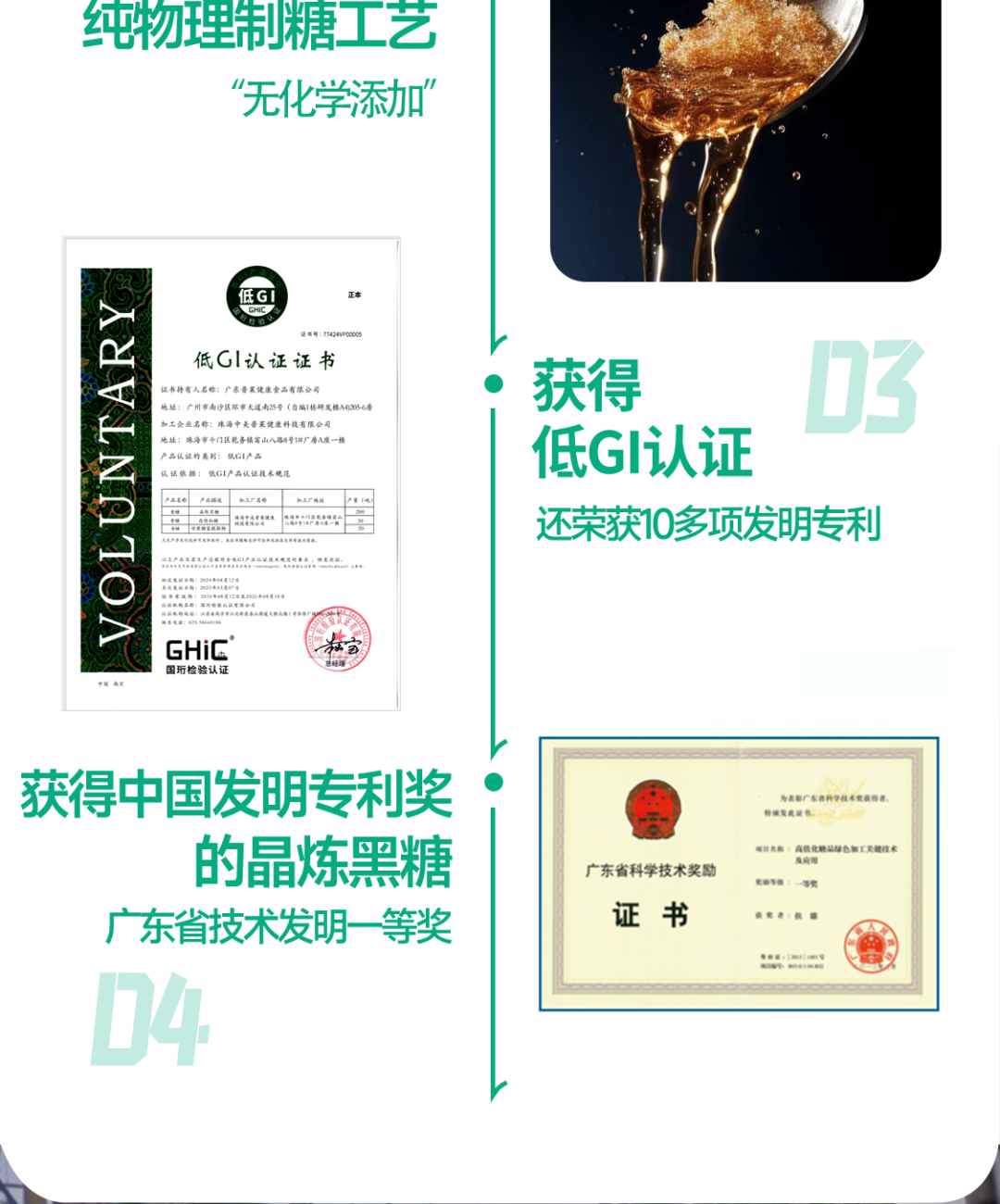 严苛认证保障:不仅获低GI认证(证书号:77424VP00006),还通过有机认证(证书号:1170P2400037),是国内少有的双认证晶炼黑糖;更通过SGS 308项农残检测(报告:GZF24-0033600-04)——在去年虫害严重时,能达到此标准的糖厂仅2家左右。