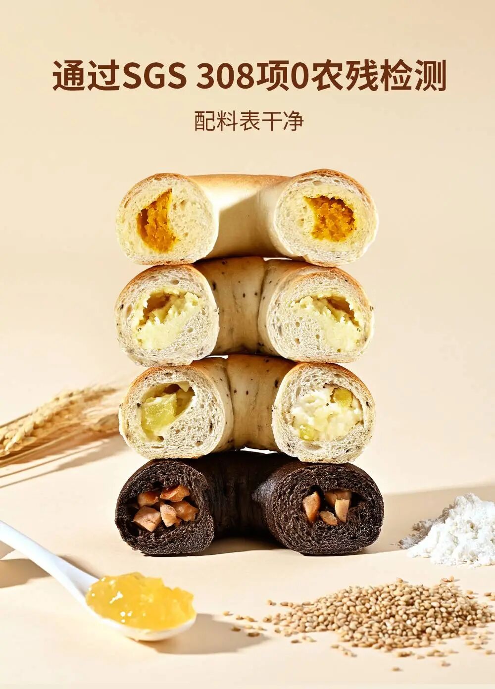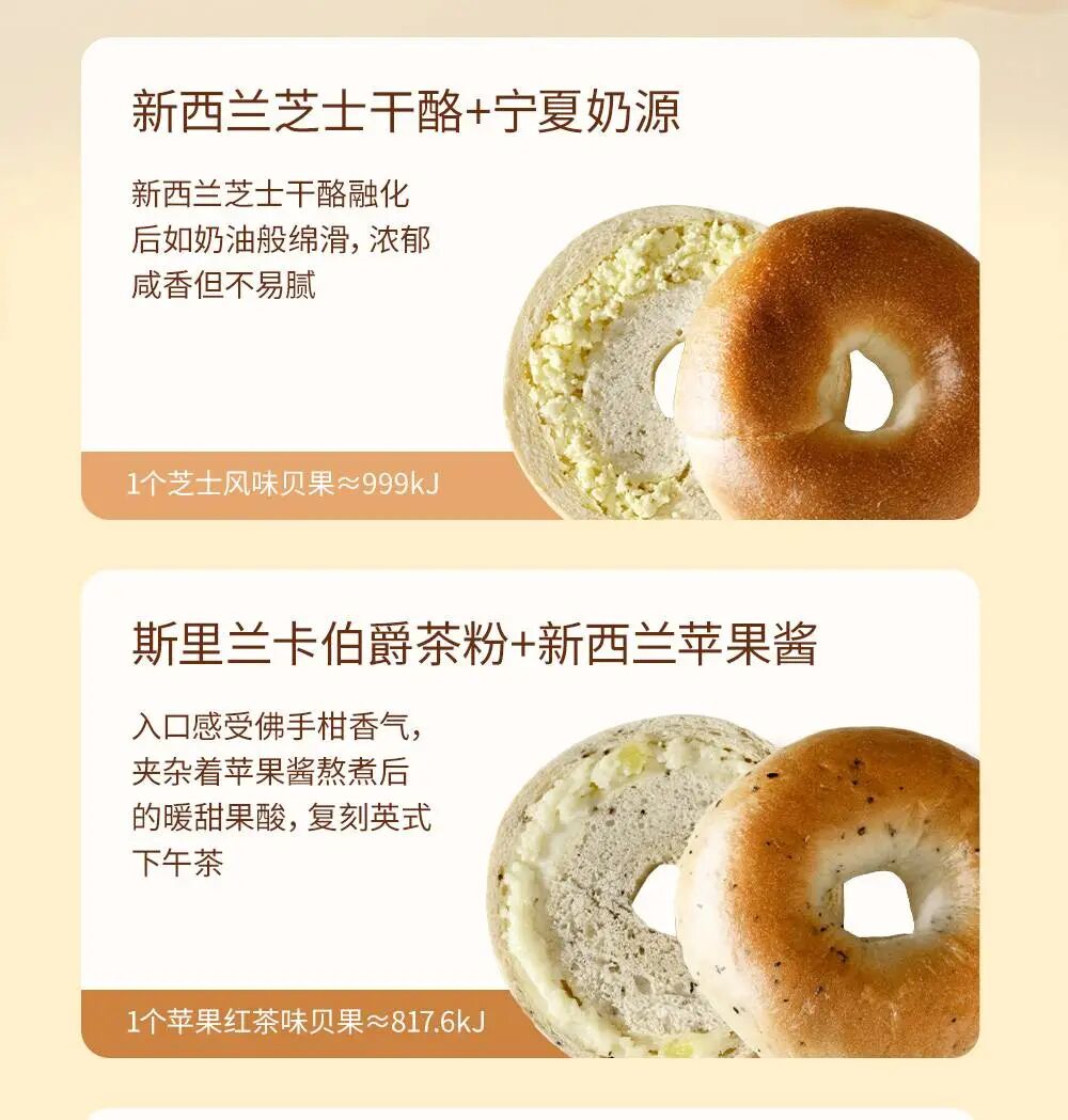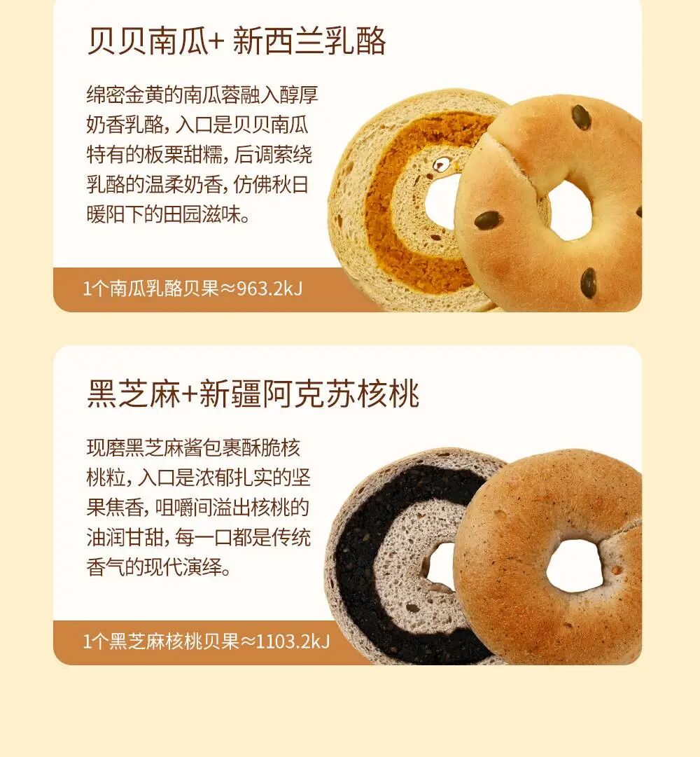 这个系列有四种风味:苹果红茶贝果、南瓜乳酪贝果、芝士风味贝果、黑芝麻核桃贝果,超多馅料满足不同偏好。