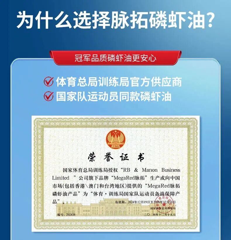 更值得关注的是,它已连续4年入选“国家体育总局训练局备战保障产品”。从原料到成品,全流程专业监控,营养与品质双稳定,MegaRed脉拓磷虾油的综合实力经得起检验。