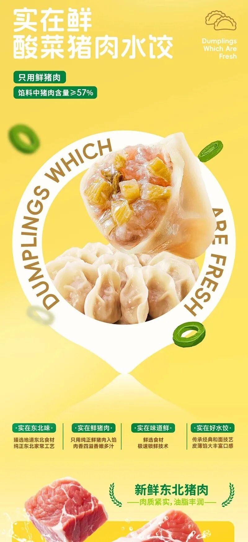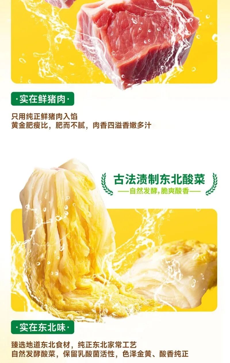 爱吃酸菜饺的人,对“正宗” 的要求从来很高,而这款直接获得了东北人的认可:“就是家里腌的酸菜味!” 酸菜选用东北传统工艺腌制的酸白菜,发酵充分,酸得清爽不刺鼻,还带着白菜的脆感;猪肉则是新鲜的东北猪肉,馅料中的猪肉含量高达 57%,每一口都能吃到扎实的肉感。
