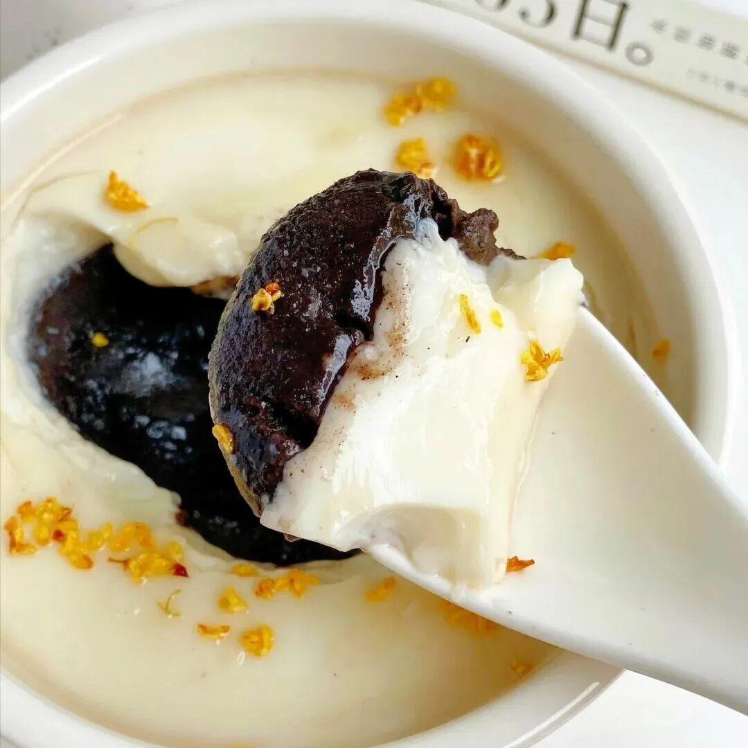 它黑白分明的分层结构——浓黑细腻的芝麻糊打底,上层铺着雪白嫩滑的炖奶,表面撒上金黄桂花,一勺下去能同时尝到芝麻的醇厚与牛奶的清甜。更有趣的是,它的稠度恰到好处,勺子插进去居然能稳稳立住,这个小细节成了网友们最爱炫耀的拍照打卡点。
