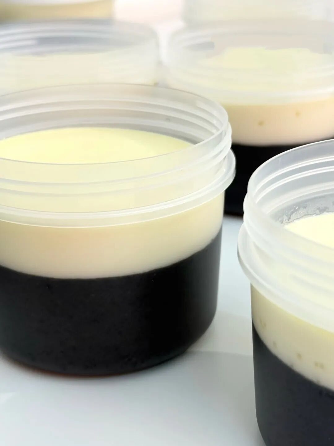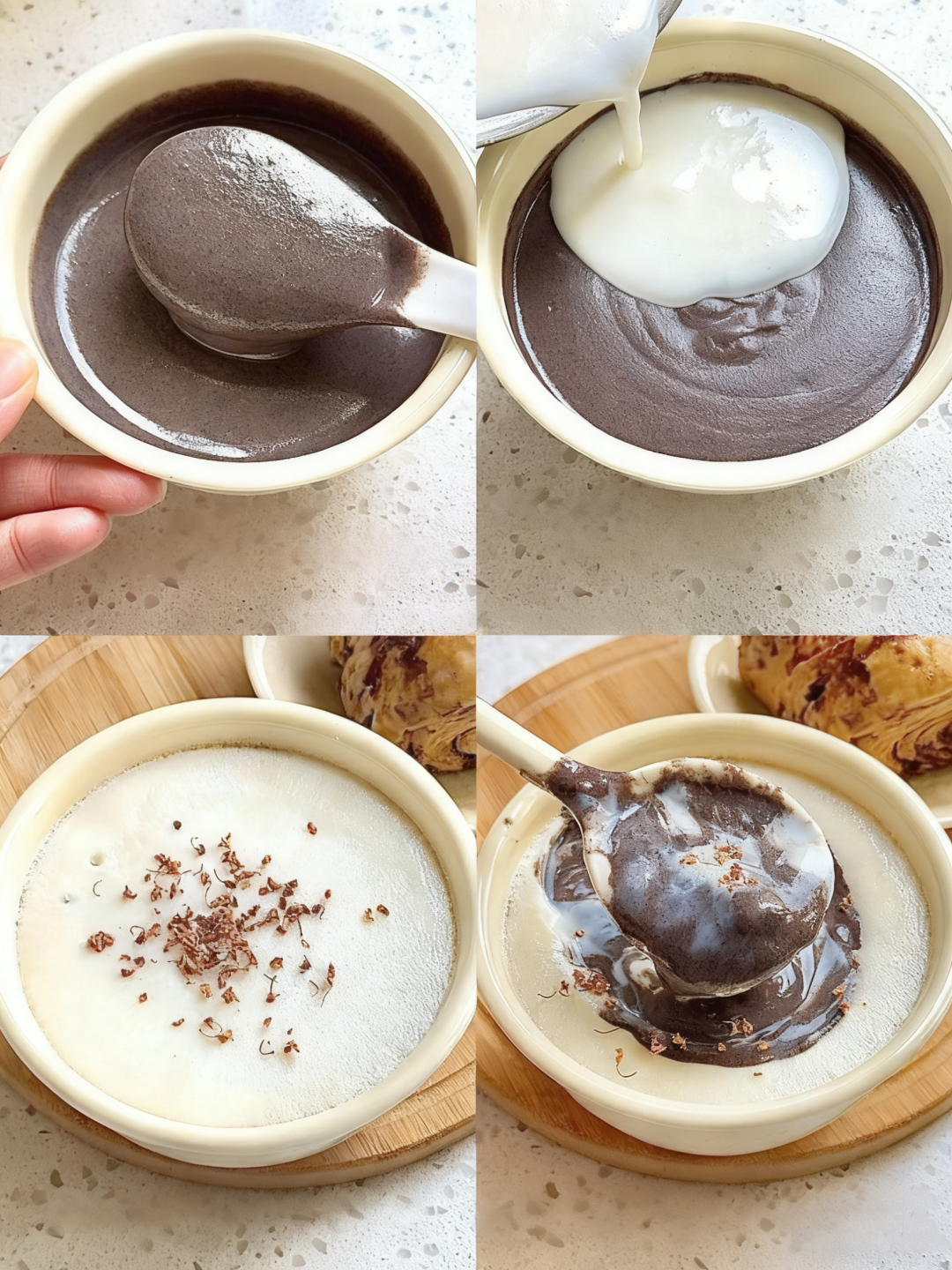 分层组合:待芝麻糊表面结膜后,缓慢倒入蛋奶液(一定要等凉透!)